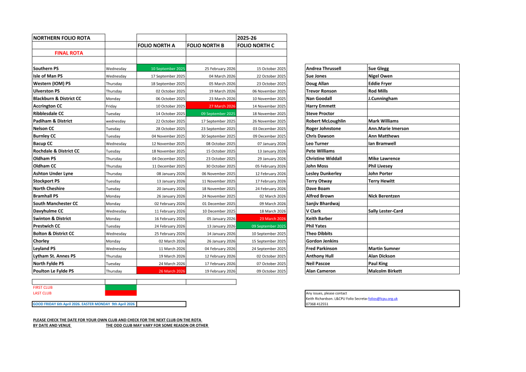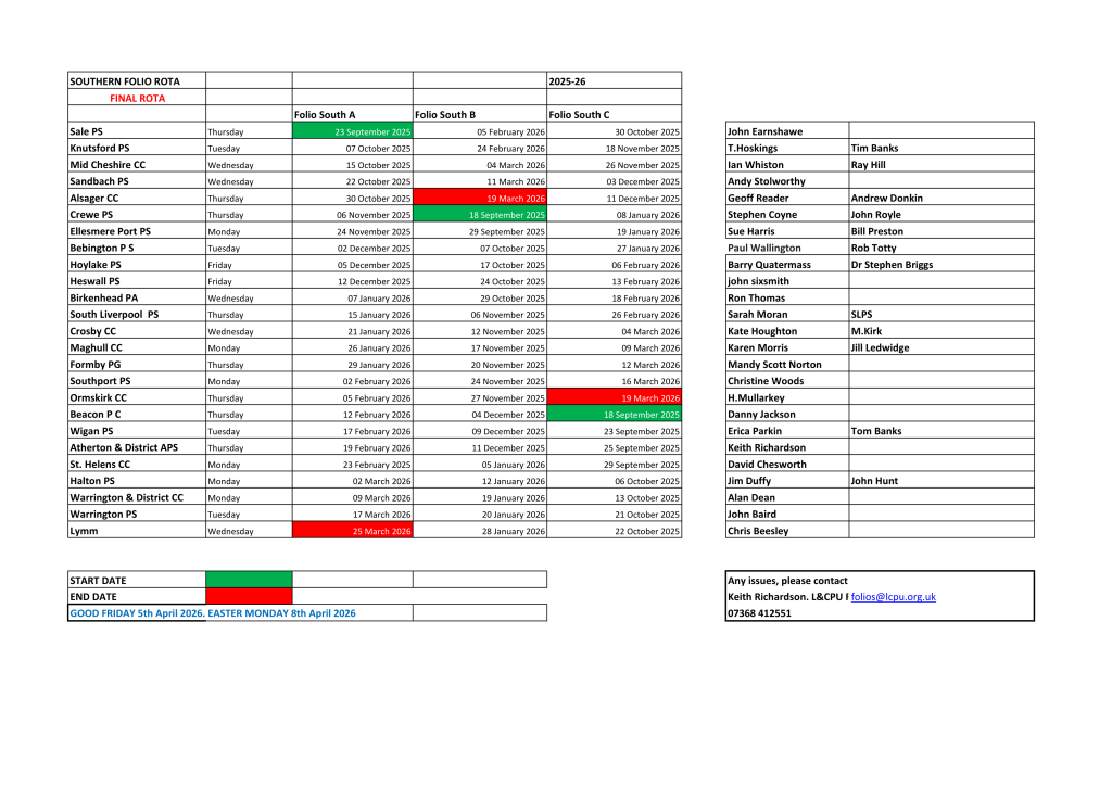 Here are the Print Folio rotas for the season starting September 2025 until March 2026.